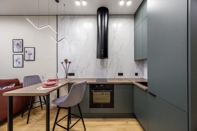 Освещение продумано до мелочей, 4 проходных выключателя, мощная островная вытяжка подчёркивает уровень кухни.