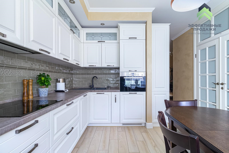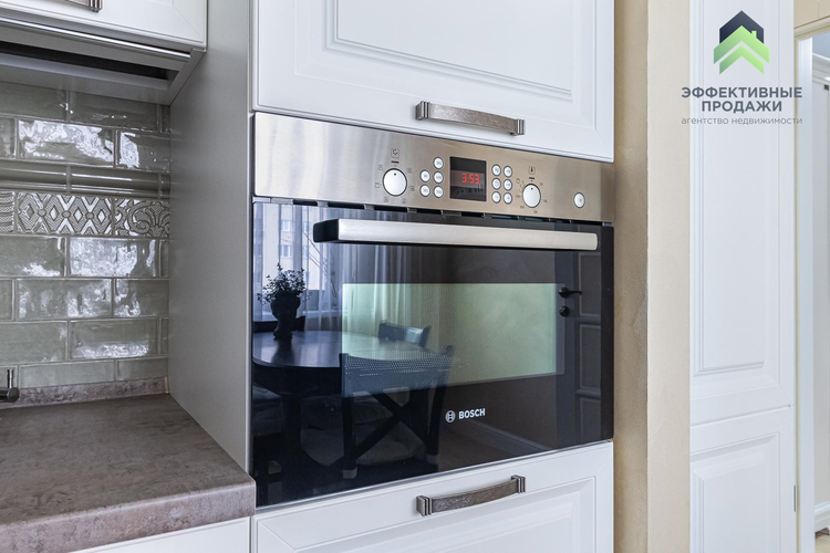 В квартире сделана современная качественная отделка: в комнатах уложена натуральная паркетная доска, в кухне, прихожей и санузле - итальянская плитка с подогревом, на стенах - венецианская штукатурка. Вся мебель в квартире изготовлена под заказ из крашеного МДФ, двери из массива, установлена кухня премиум класса с фурнитурой (+доводчики) Blum, укомплектована всей необходимой техникой Bosch (варочная поверхность, духовой шкаф, посудомоечная машина, встроенный холодильник). В квартире установлен кондиционер и бойлер.