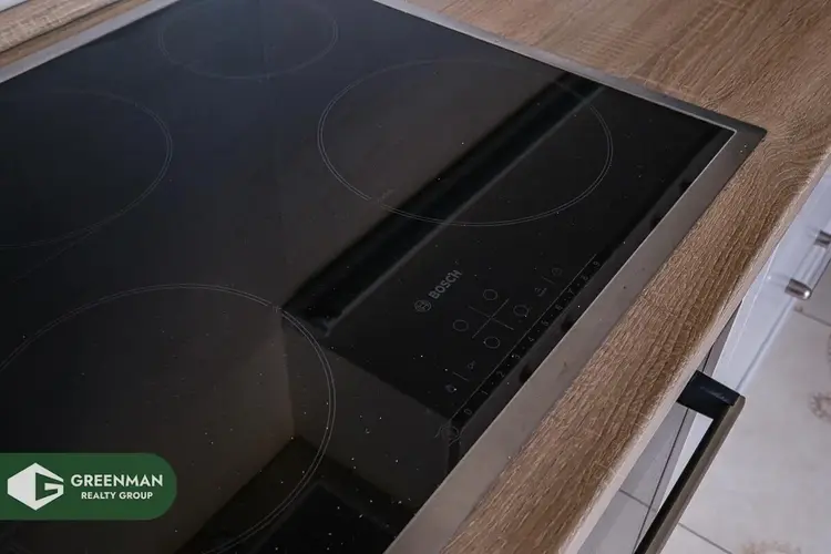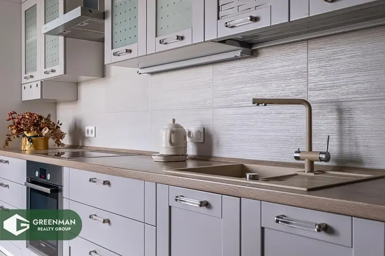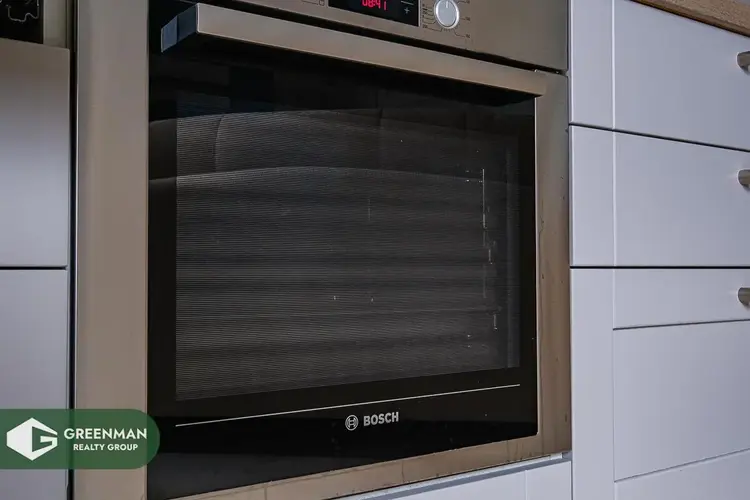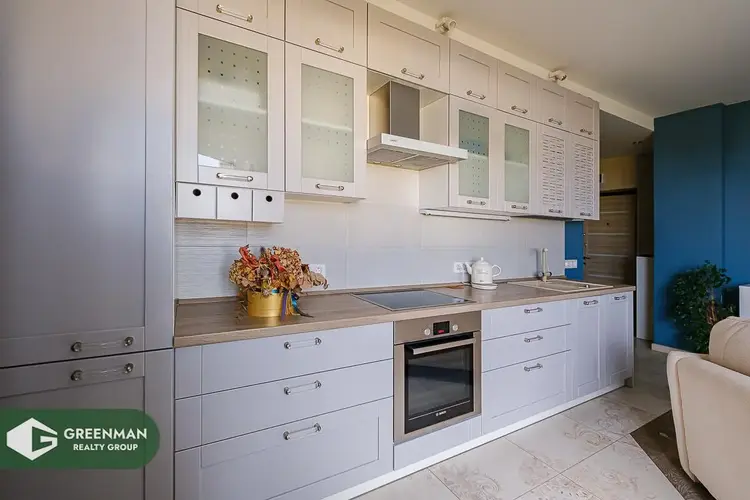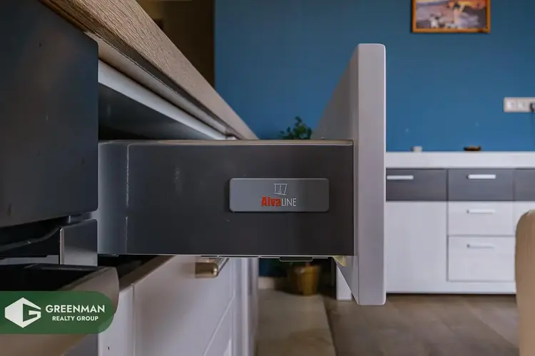 Жилая с кухней — просторная, зонированная на кухню, столовую и гостиную. По всей стене установлен кухонный гарнитур в светлых тонах с большим запасом хранения и выдвижными системами AlvaLine; фартук — плитка, столешница под дерево. Встроенная техника: индукционная варочная поверхность Bosch, духовой шкаф Bosch, посудомоечная машина Bosch, высокий встроенный холодильник Electrolux, вытяжка. У окна — компактная столовая группа, в гостиной — место для дивана и медиазоны. Из этой комнаты — удобный проход в спальню.