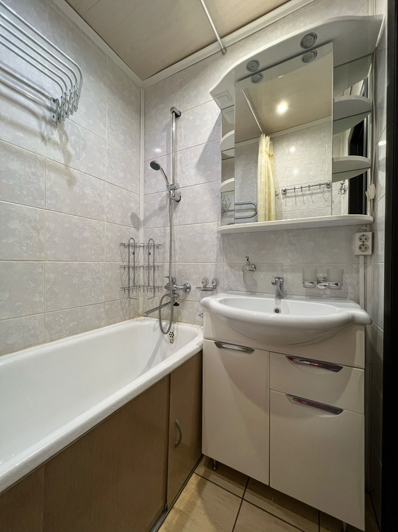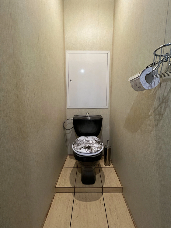 ⁃ В зале, коридоре и кухне лежит ламинат высокого класса. В коридоре и санузле плитка.