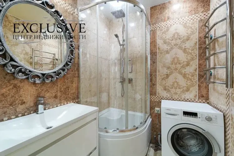 Раздельный санузел с современной плиткой, душевой кабиной и техникой BOSCH