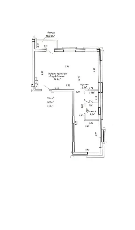 Свобода планировки: Просторная площадь 61,6м2 (по СНБ) и удачное расположение окон (запад/восток) открывают простор для функциональных решений.