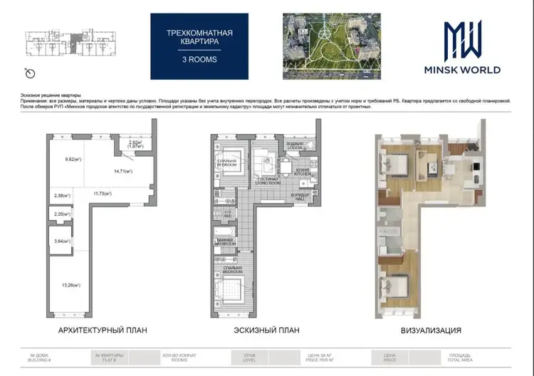 Квартира свободной планировки формата евротрешка: кухня-гостиная, две комнаты на обе стороны, зона под гардеробную, раздельный санузел. Данная планировка позволяет сделать мастер-спальню. Застекленная лоджия с видом на будущий парк.