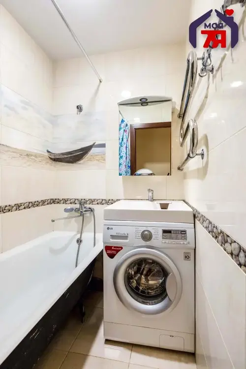 - Санузел раздельный. Ванная комната облицована плиткой в светлой гамме с декоративными акцентами. Установлены ванна, раковина с местом для стиральной машины. Сантехника и полотенцесушитель в хорошем состоянии. Санузел оформлен в едином стиле с ванной.