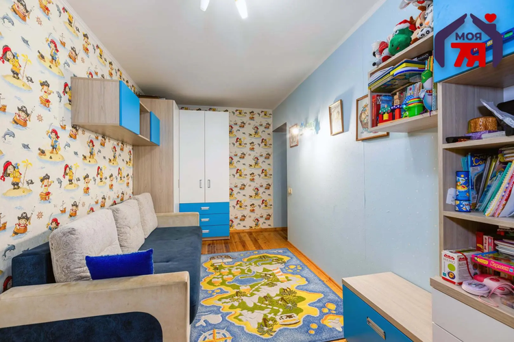 - Детская комната оформлена функционально и живо. Тематические обои создают позитивное настроение, при этом не утомляют. Натуральное напольное покрытие практично и комфортно для повседневной жизни. Рабочее место организовано у окна, есть чёткое зонирование для учёбы, отдыха и хранения.