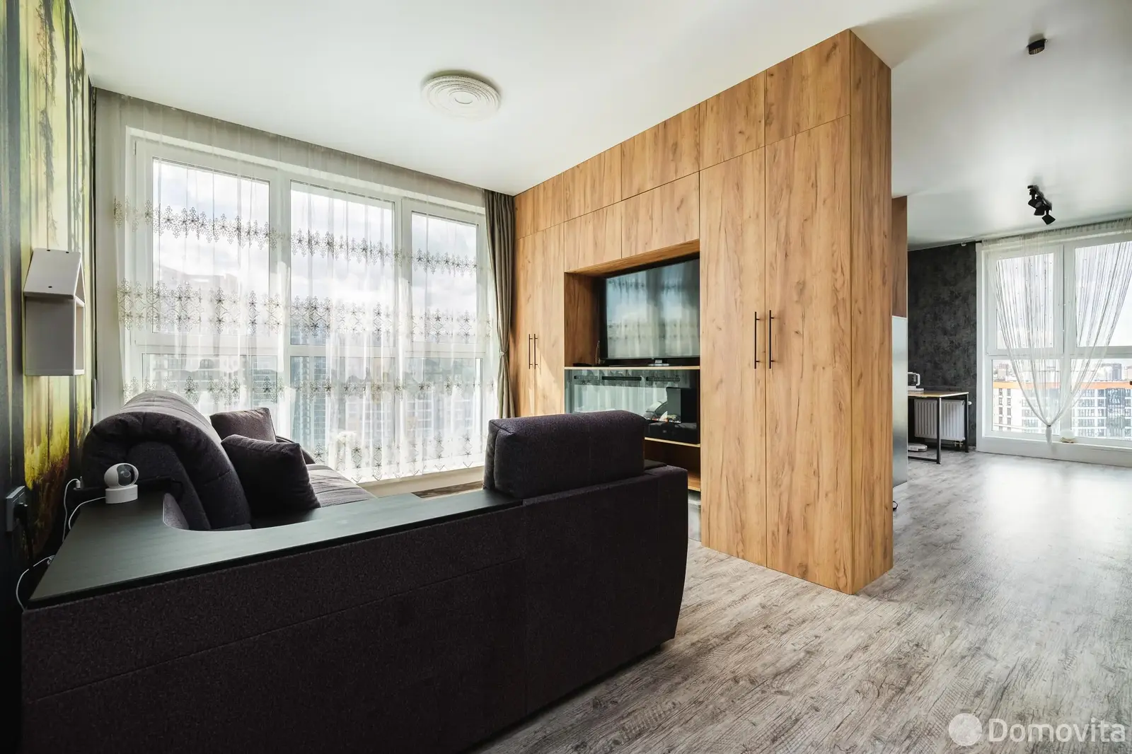 Уникальность данной квартиры заключается в ее планировке. Никаких лишних стен не возводилось, а в качестве зонирования комнат установлена стильная гардеробная система с нишами для хранения.