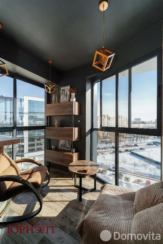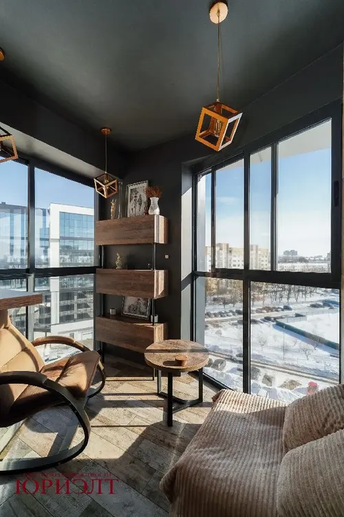 Лоджия выполнена под лаунж зону с кальянной, оборудована спальным местом, есть небольшой козырек на фасаде, который после 12 часов сдерживает активные лучи солнца.