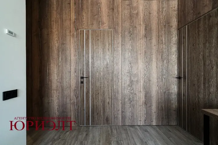 В прихожей дорогая итальянская широкоформатная плитка, зеркало в пол с подсветкой, парящие шкафы,
