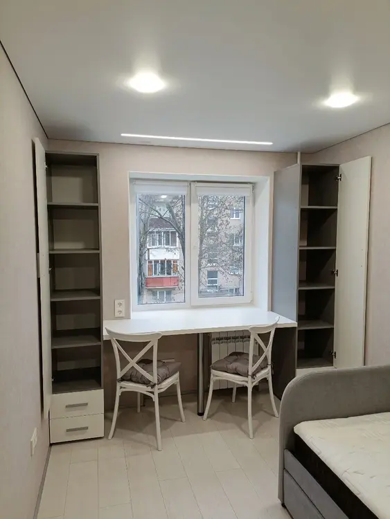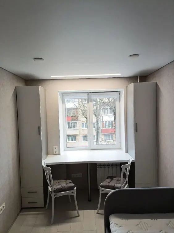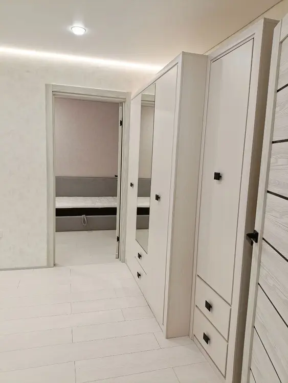 8. В комнатах: Встроенные шкафы и стол-парта для работы или учёбы, стулья , световая линия на потолке. Большой трёхместный угловой диван с нишей для хранения вещей, шкаф для одежды. Телевизор Xiaomi 4k, тумба под ТВ.