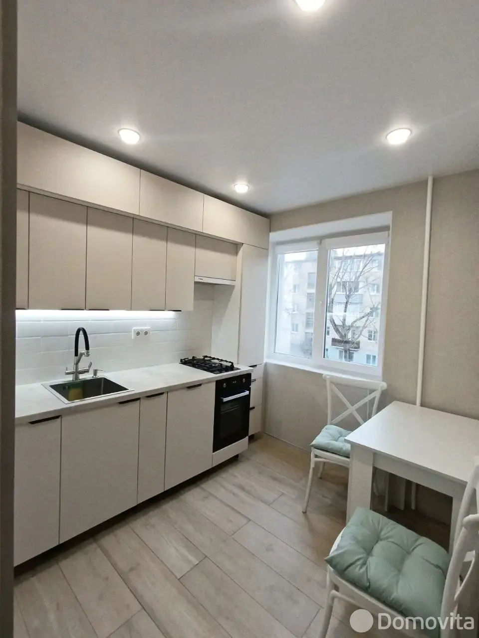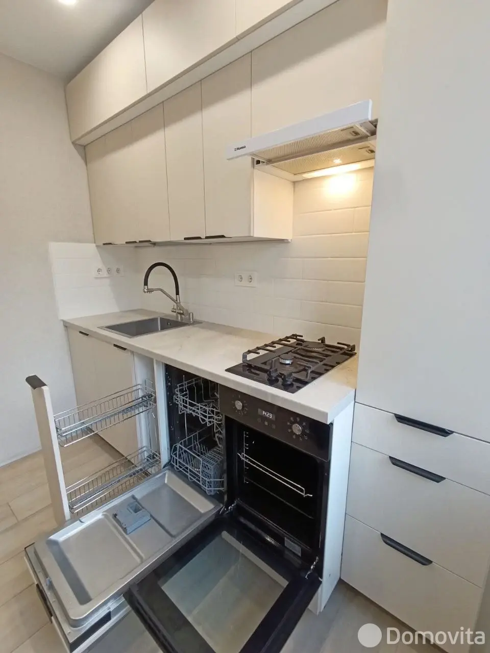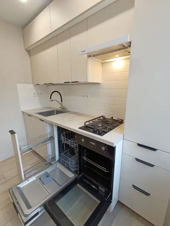 7. На кухне: спроектированная под заказ встроенная кухня, имеется посудомоечная машина Candy, газовая плита Gorenje, электродуховой шкаф Weissgauff, умывальник, мощная электровытяжка Hansa, стол, стулья.