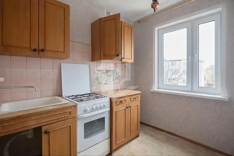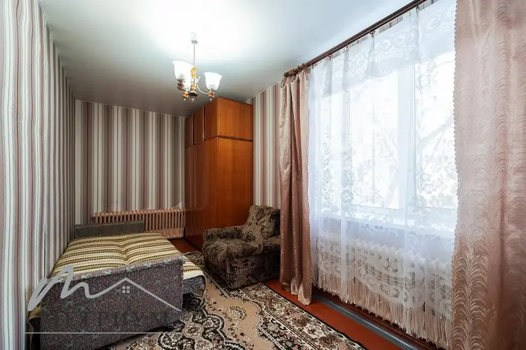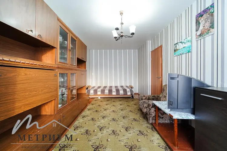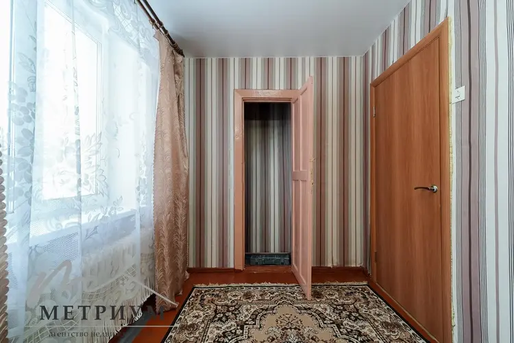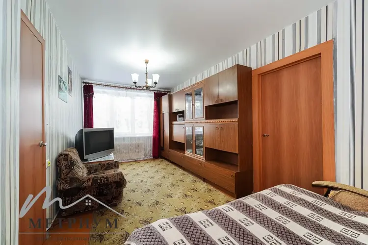 Квартира в жилом состоянии. Удобная планировка для жизни: изолированная комната и проходная гостиная, полы деревянные, на стенах обои. Санузел совмещенный, на полу и стенах плитка. Входная дверь — металлическая.