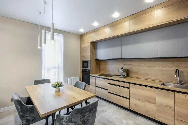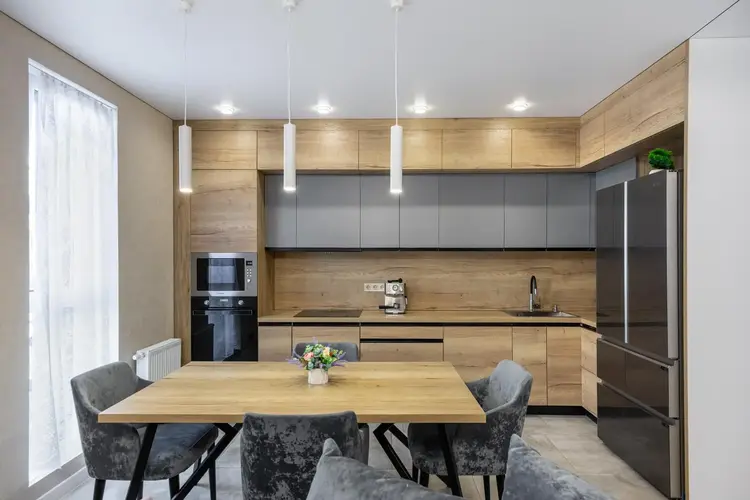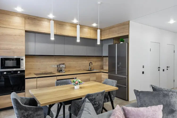 -Большие панорамные окна наполняют пространство светом и открывают вид на благоустроенный зелёный двор.