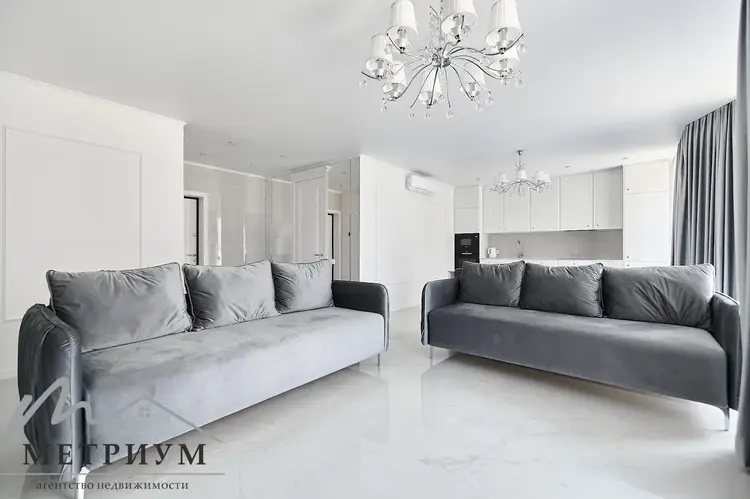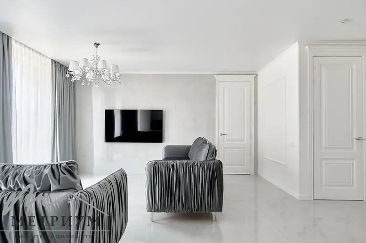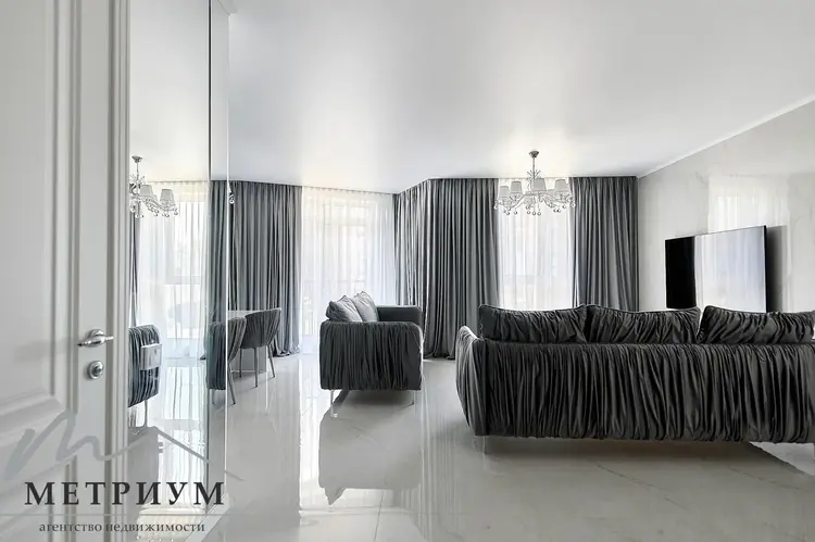 В гостиной зоне телевизор LG с диагональю 65 дюймов, два дивана итальянского дизайна с системой хранения и покрытием алькантара. Австрийские люстры. Итальянские портьеры. Дополнительное удобство создает выход из комнаты на «французский» балкон.