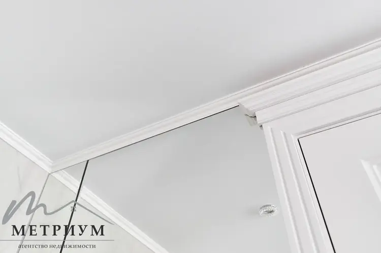 Прихожая оборудована вместительной гардеробной комнатой, банкеткой. Зеркальная отделка стены.