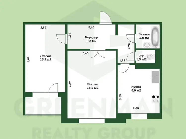 Две жилые комнаты-16,2 кв.м. и 13,2 кв.м., с выходом на застекленную лоджию.