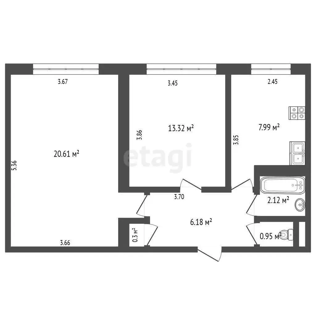 · Две просторные комнаты: 20,6 м2 / 13.6 м2