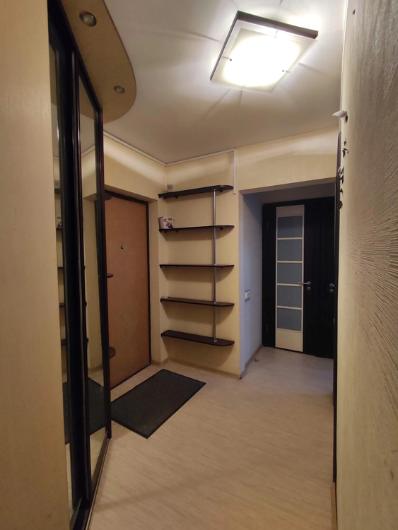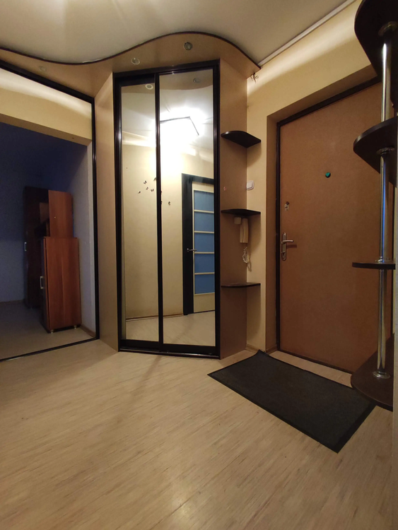 Металлическая дверь. Пластиковые окна. Балкон застеклён. В ванной и туалете плитка. Два шкафа-купе в малой комнате и в коридоре. Мебель остаётся покупателю.