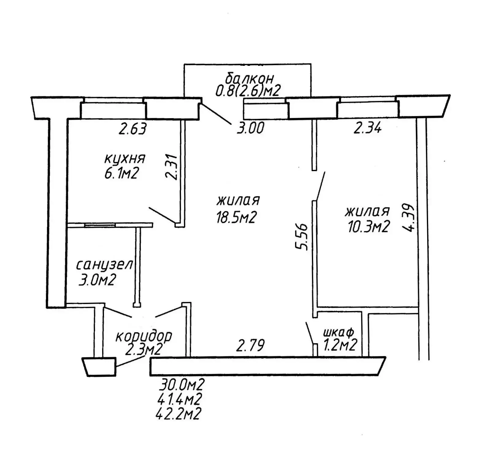 Площадь 42,2/18,5/6,1