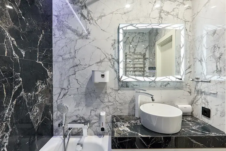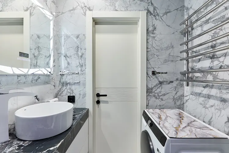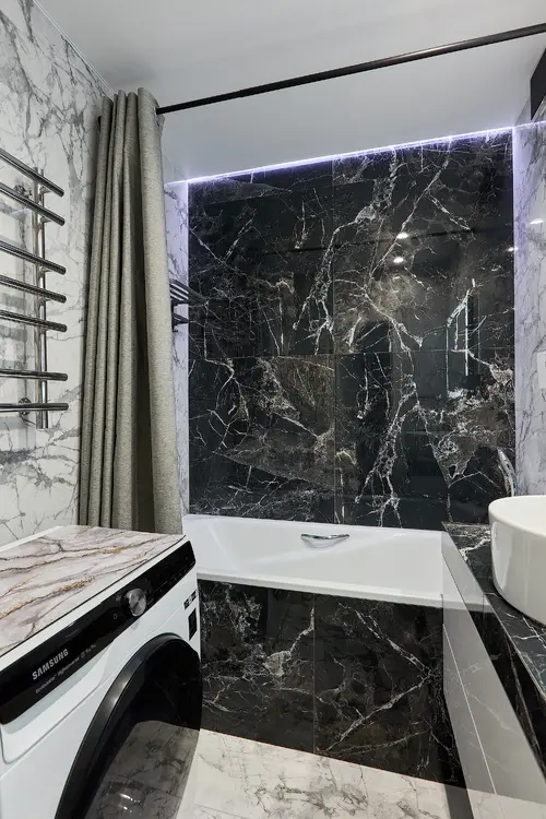1 санузел: ванна 170*70 и умывальник Roca, стирально-сушильная машина Samsung, умное, интерактивное зеркало с подсветкой.
