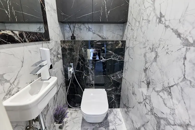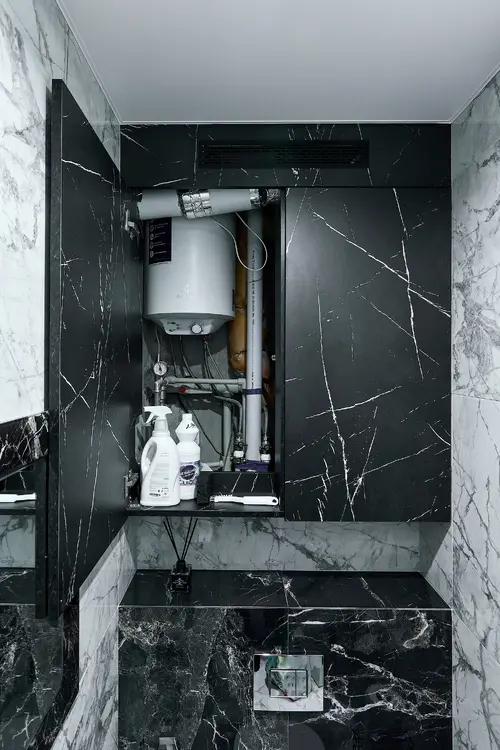 Встроенная мебель для хранения личных принадлежностей, средств гигиены и прочей бытовой химии, все смесители Gappo.