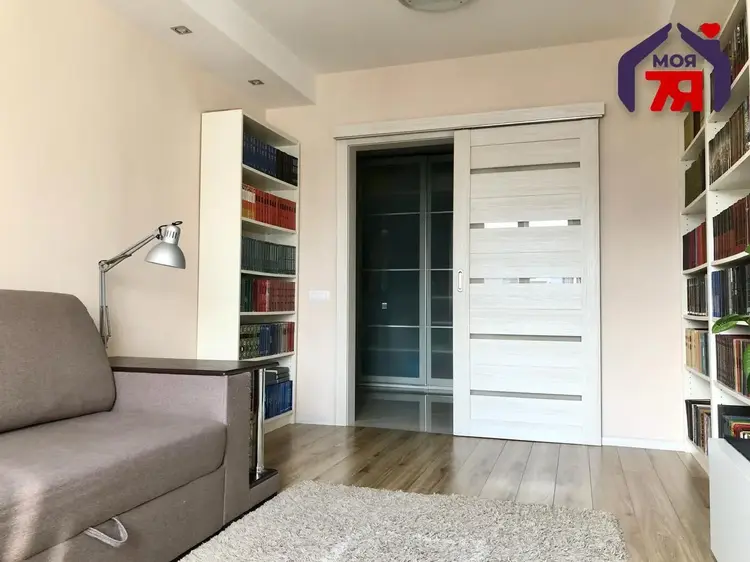 - Ремонт выполнен в современном стиле с использованием качественных материалов. Светлые тона стен, ламинат под натуральное дерево и двери со стеклянными вставками создают атмосферу уюта и лёгкости. В ванной, туалете, кухне и коридоре установлены натяжные потолки с точечным освещением, которое визуально увеличивает пространство и наполняет комнаты светом.