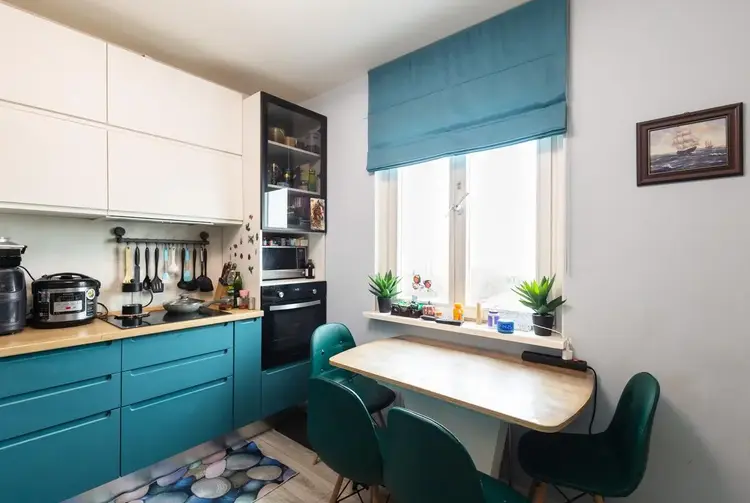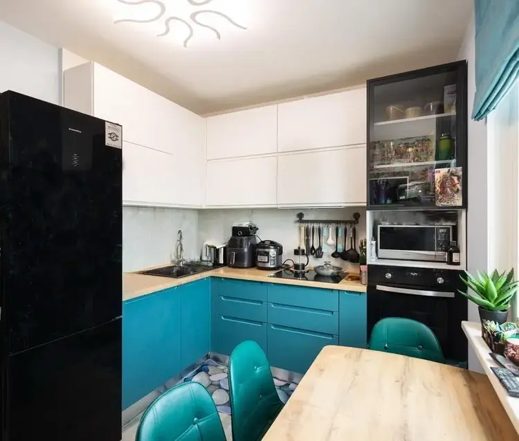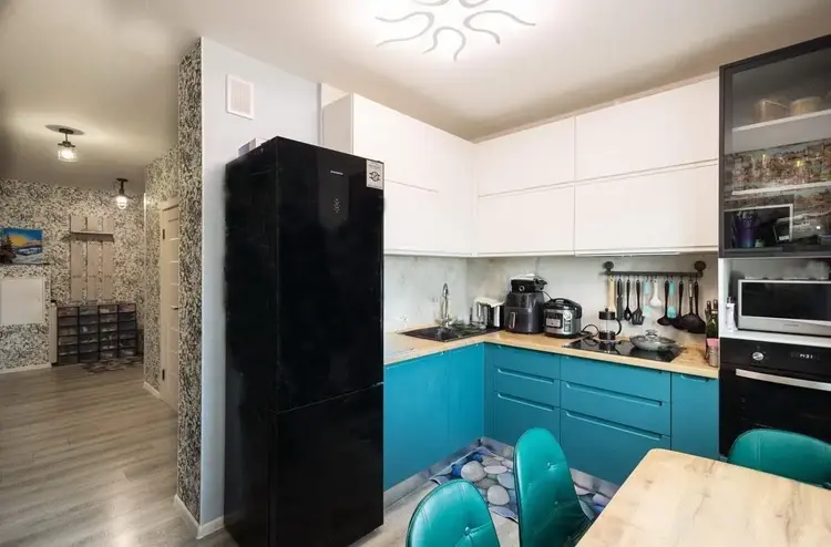 Функциональная кухня оборудована фурнитурой Блюм и всей необходимой техникой Maunfeld – вытяжка, электрические варочная панель и духовой шкаф, холодильник, посудомойка.