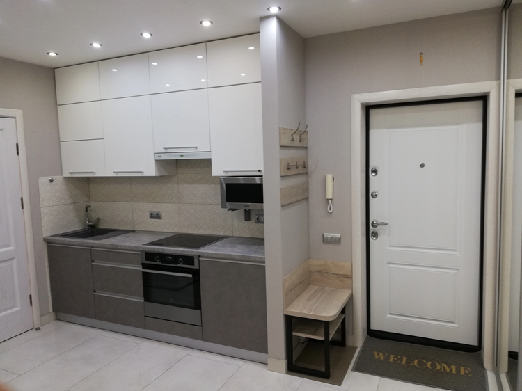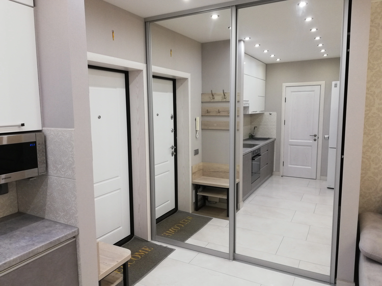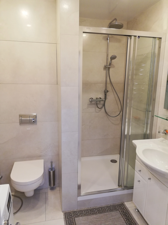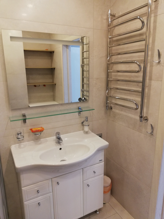 Совмещённый санузел.Душевая кабина,проточный водонагреватель. При желании, есть возможность установить накопительный водонагреватель.Инсталляция,гигиенический душ.Зеркало с сенсорным выключением с подогревом(антипар)