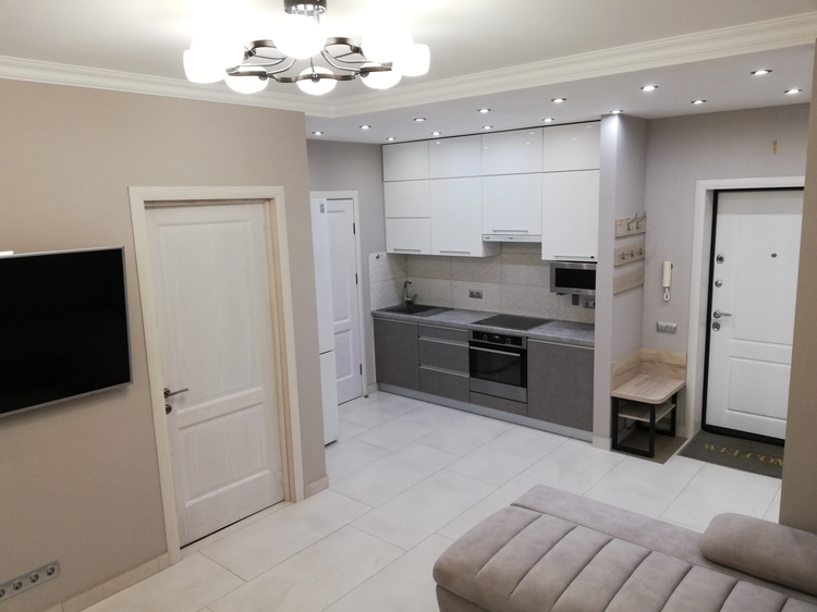Высокие потолки покрашены водоэмульсионной краской.Зонированное освещение.Экологически чистые бельгийские обои на стенах.