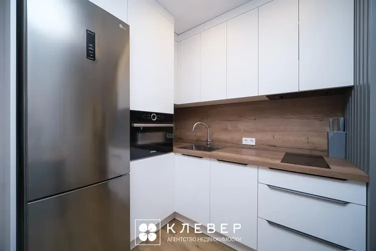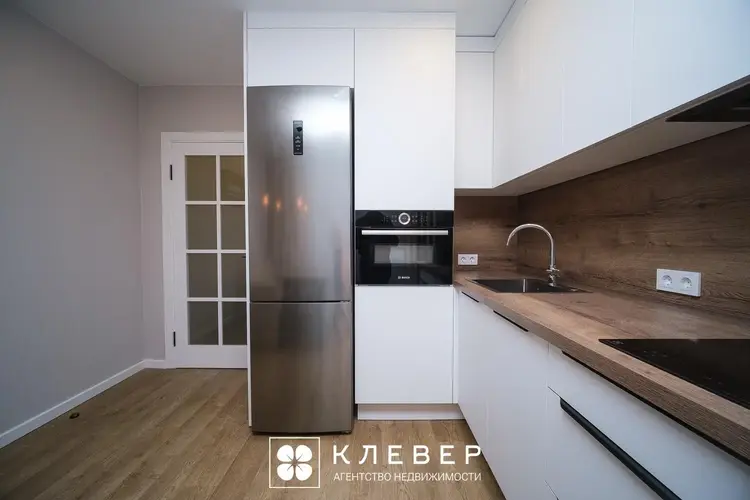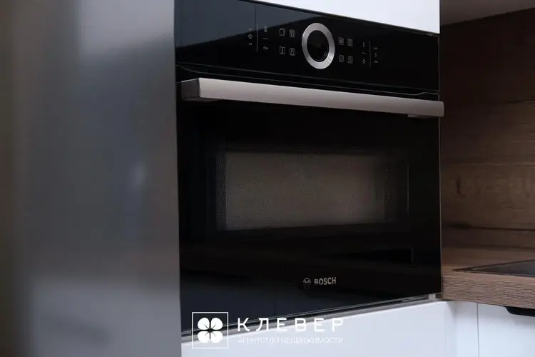 Большая, просторная кухня укомплектованая всей необходимой техникой: посудомоечная машина, варочная панель, духовым шкафом Bosch с функцией микроволновки, вытяжка, холодильник.В кухне установлен диван с полноценным спальным местом и обеденной зоной.