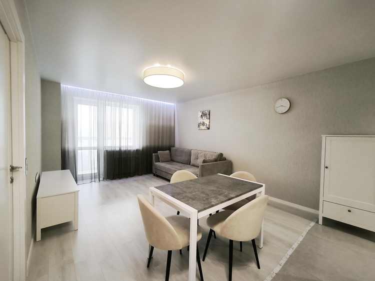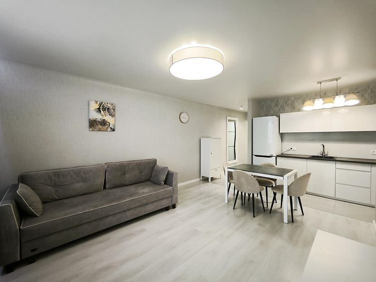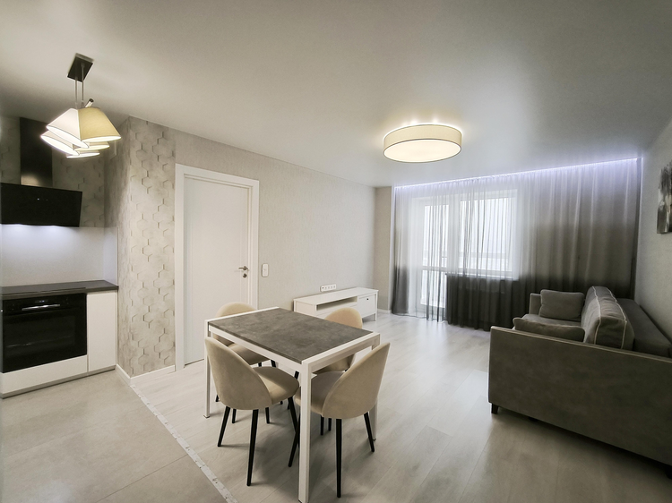 Квартира на 14-м этаже полностью готова к проживанию. Реализовано грамотное зонирование пространства, квартира функционально продумана до мелочей. Укомплектована мягкой и корпусной мебелью, бытовой техникой.