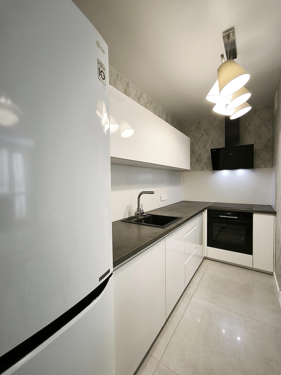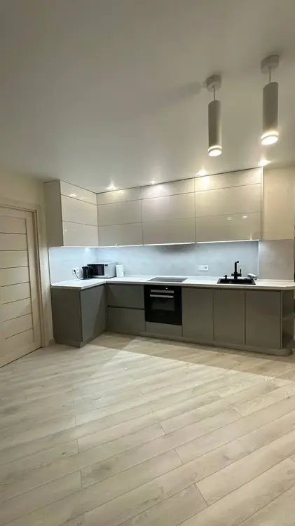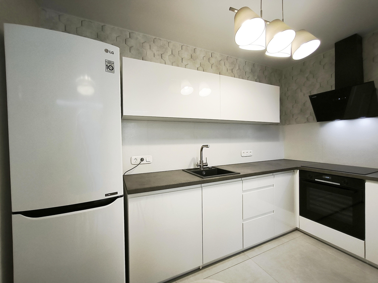 Встроенный кухонный гарнитур с мебелью и техникой: варочная панель, духовой шкаф, вытяжка, холодильник, кухонная группа.