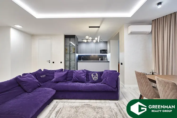 Потолки сделаны из ГКЛ с регулируемой подсветкой, на стенах декоративная штукатурка, а на полу итальянская плитка и ламинат 33го класса в зоне спальни.