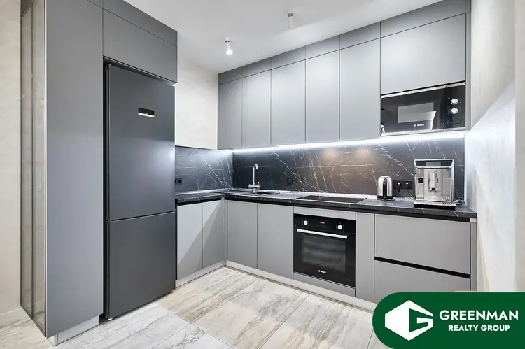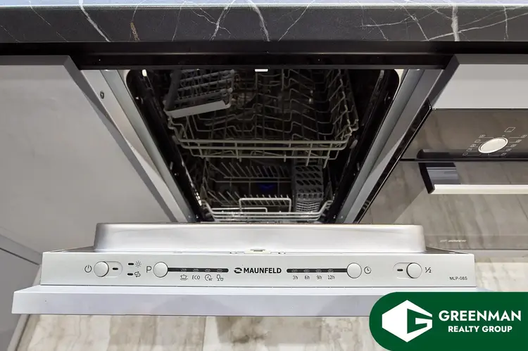 Установлена кухня с полным комплектом техники: Варочная панель, духовой шкаф, свч, холодильник, фильтр воды, вытяжка и посудомоечная машина.