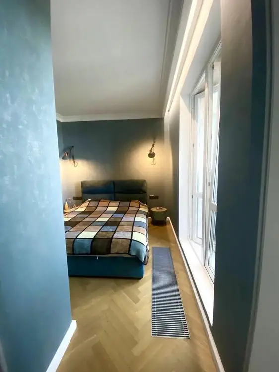Изолированная спальня 8,6 кв.м с выходом на большую застеклённую лоджию с отделкой.