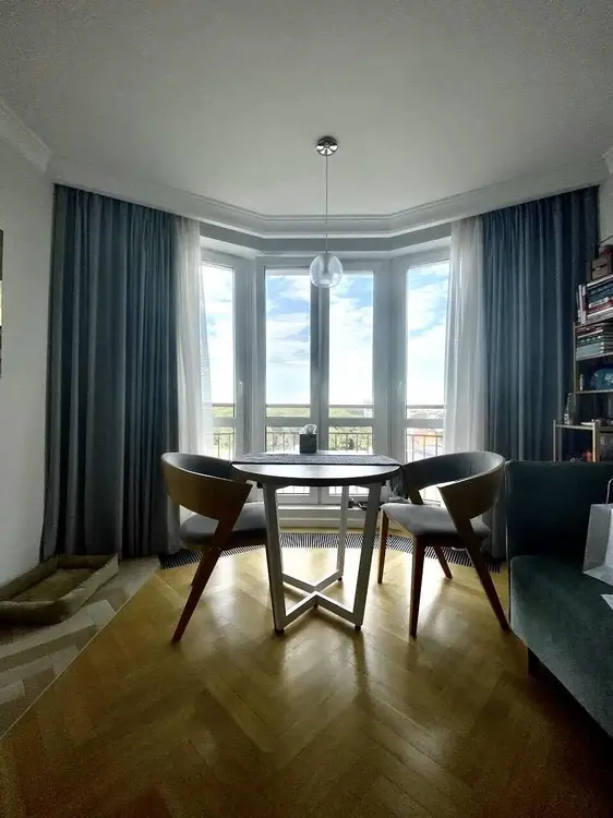 Тёплая и солнечная квартира находится на десятом этаже тринадцатиэтажного дома. Окна выходят во двор на восточную сторону. Потолки высотой 2,7 метра ,панорамные окна в пол( ПВХ) придают квартире грандиозность и атмосферность.