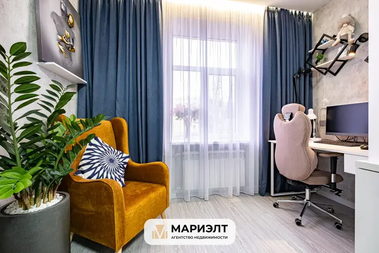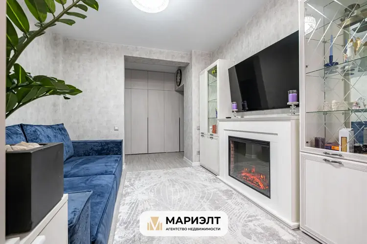 В гостиной оборудовано рабочее место и место отдыха с электрокамином.