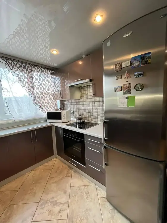 Площадь квартиры по СНБ - 59,4 кв.м. Большая кухня-столовая: 15,5 кв.м., в которой установлен электрокамин.