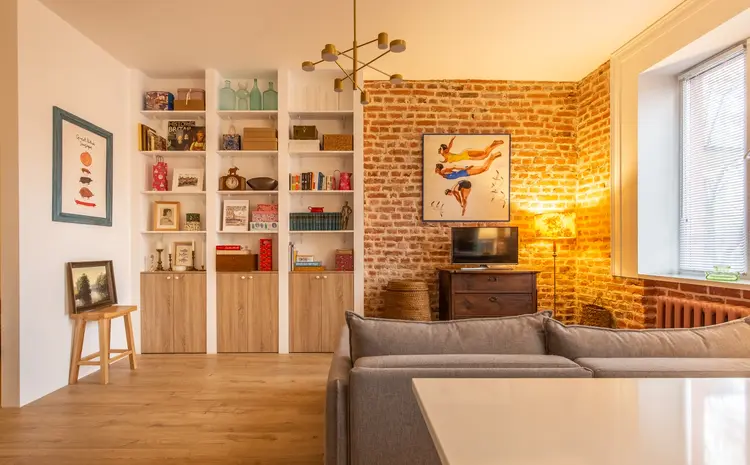 Гостиная визуальна отделена от кухни островом и комфортабельным угловым диваном. Напротив дивана имеется место размещения большого телевизора, чтобы наслаждаться вечерами за просмотром любимых фильмов. Грамотно организована и зона хранения. Имеется большой стеллаж под потолок для хранения всего необходимого.