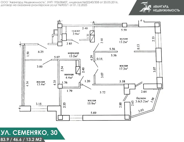 Площадь: СНБ – 62,0 м2/ Общая – 59,1 м2/ Жилая – 31,2 м2/ Кухня – 10,0 м2.