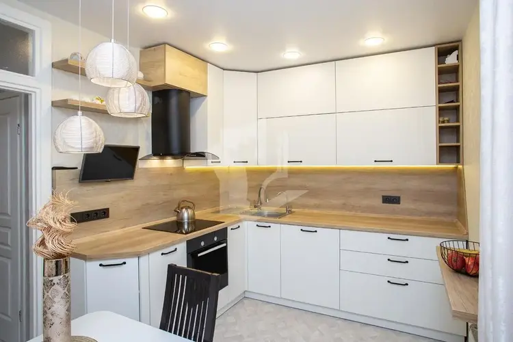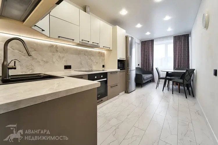 Кухня: 10,0 м2, встроенный гарнитур с бытовой техникой: электрический духовой шкаф, индукционная варочная панель, вытяжка, холодильник, посудомоечная машина, микроволновая печь.