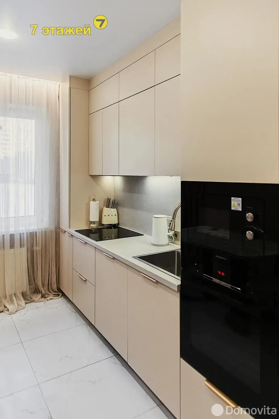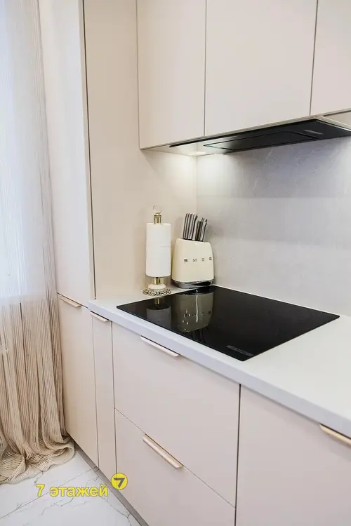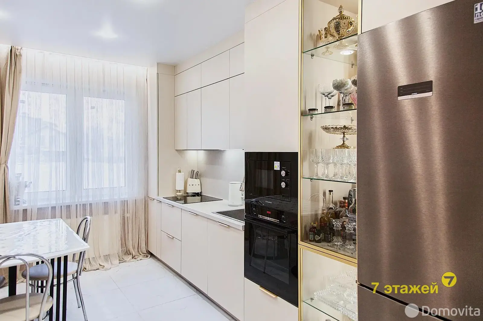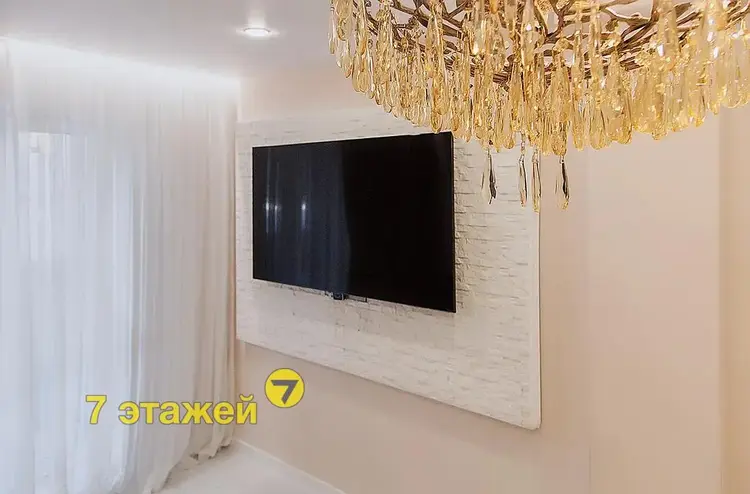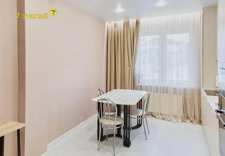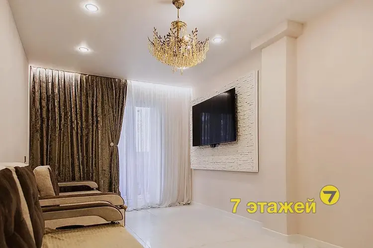 На полу уложена плитка и линолеум, потолки натяжные, стены окрашены, а санузел облицован плиткой. Современная встроенная кухня со следующей техникой: холодильник, посудомоечная машина, варочная панель, духовой шкаф, печь СВЧ и вытяжка.