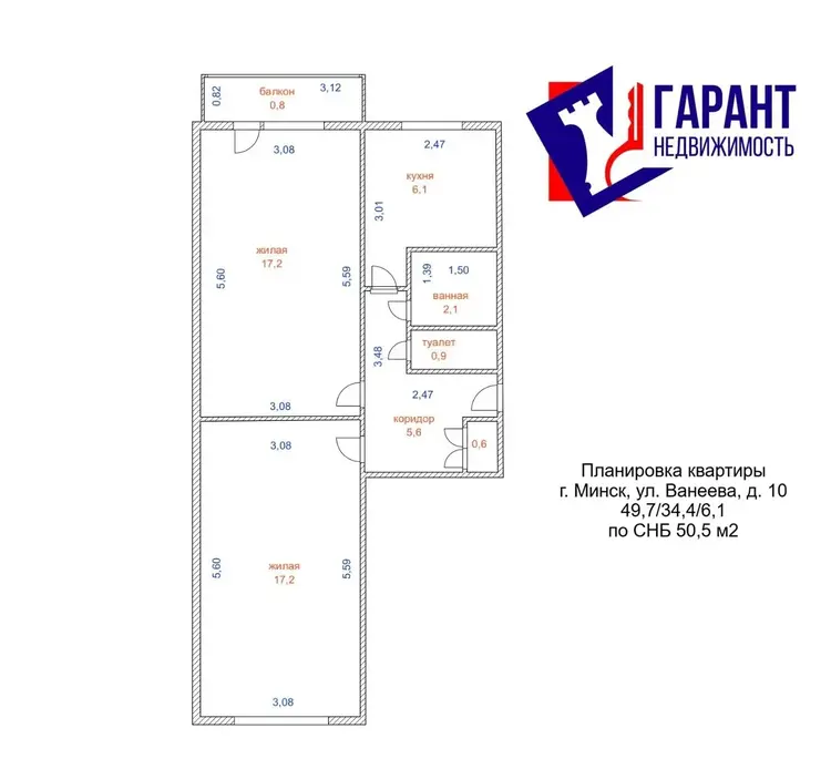 Площадь по СНБ – 50,5 м2, общая – 49,7 м2, жилая – 34,4 м2, кухня – 6,1 м2, 2 большие комнаты по 17,2 м2, раздельный санузел. Имеется подвальное помещение 4 м2.
