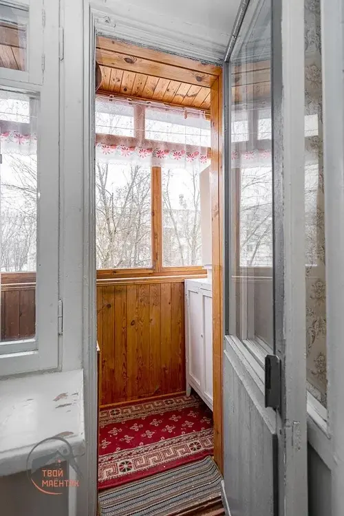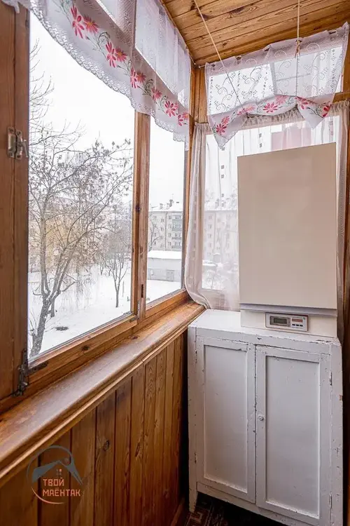 Балкон утеплен и застеклен деревянной рамой, оборудованы шкафчики для хранения.
