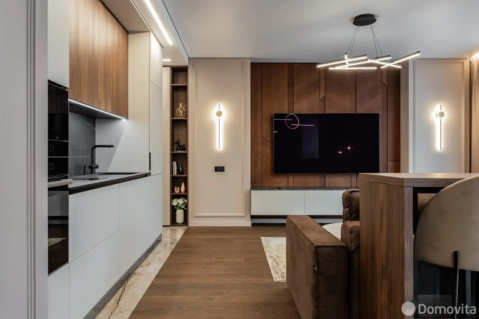 По СНБ площадь квартиры составляет 56.5 кв. м, а жилая площадь с кухонным оборудованием – 49.6 кв. м. На полу уложена паркетная доска Coswick и керамогранит. Все межкомнатные двери (Лацио). Вся мебель изготовлена под заказ по индивидуальному дизайн-проекту. Установлена надежная входная металлическая дверь усиленной конструкции, которая обеспечивает максимальную шумоизоляцию. Также имеется видеодомофон.