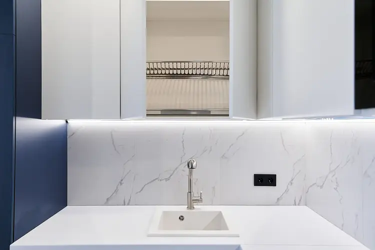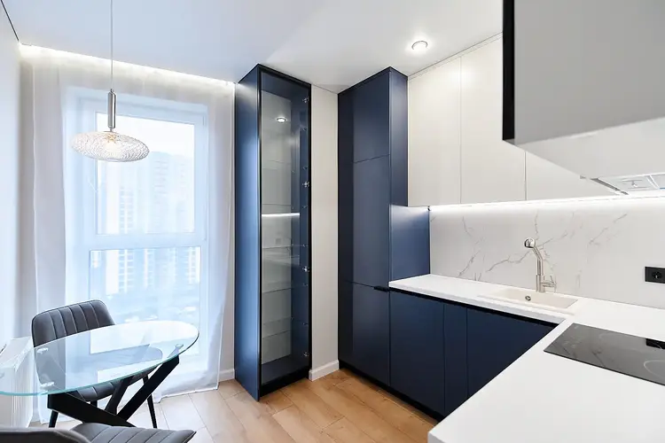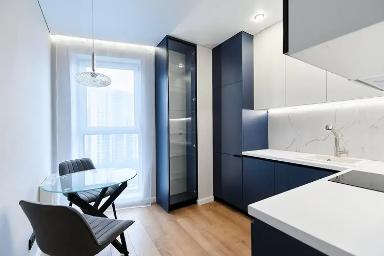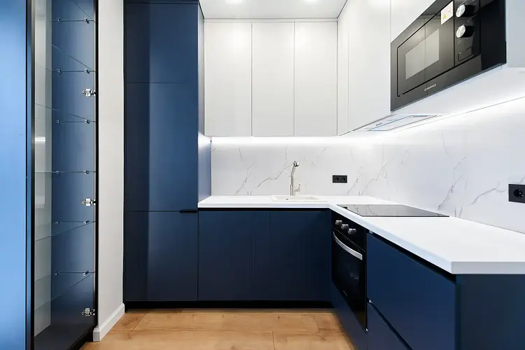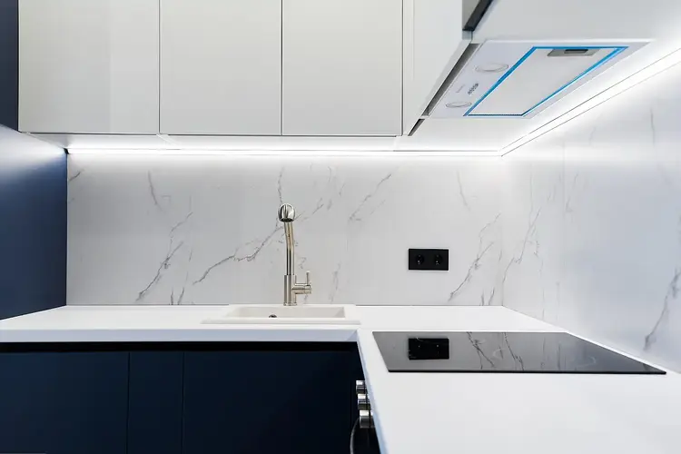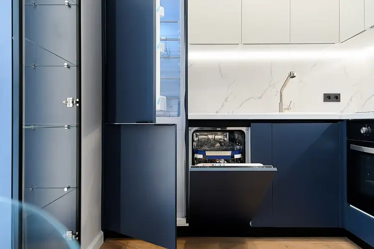 Качественная бытовая техника: встроенные холодильник Hansa, посудомоечная машина и вытяжка Maunfeld.