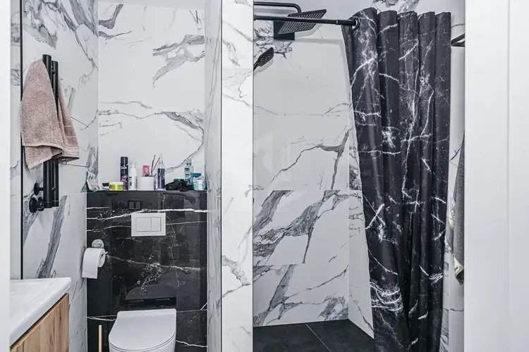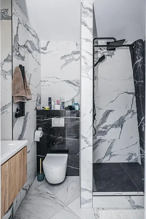 · Современный санузел с мраморной плиткой, единым стилем, подвесным унитазом, душем, и умывальником.