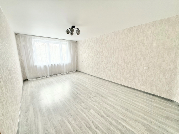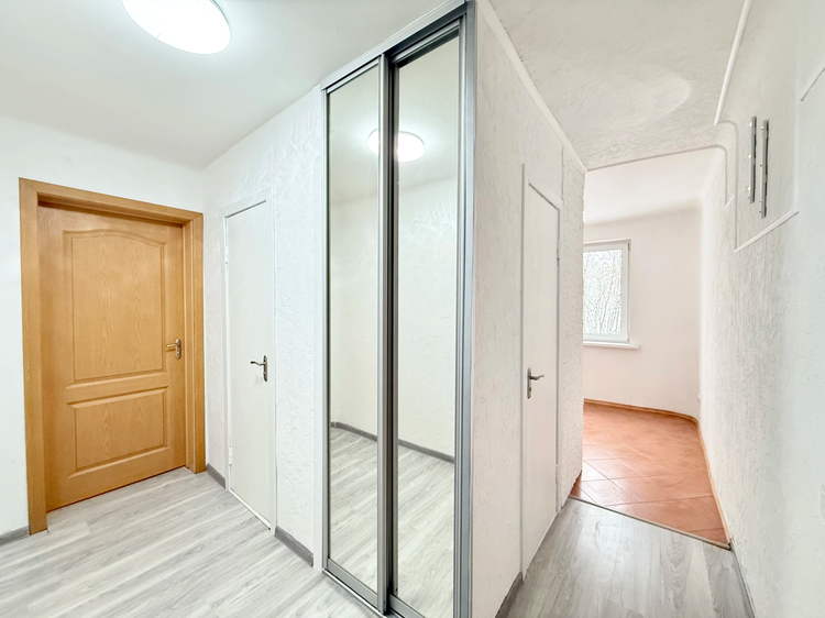 Окна – стеклопакеты. Входная дверь двойная. На полу ламинат и плитка. Потолки в коридоре, кухне и меньшей комнате выровнены и окрашены, в большой комнате натяжной потолок матовый. В коридоре вместительный зеркальный шкаф-купе.
