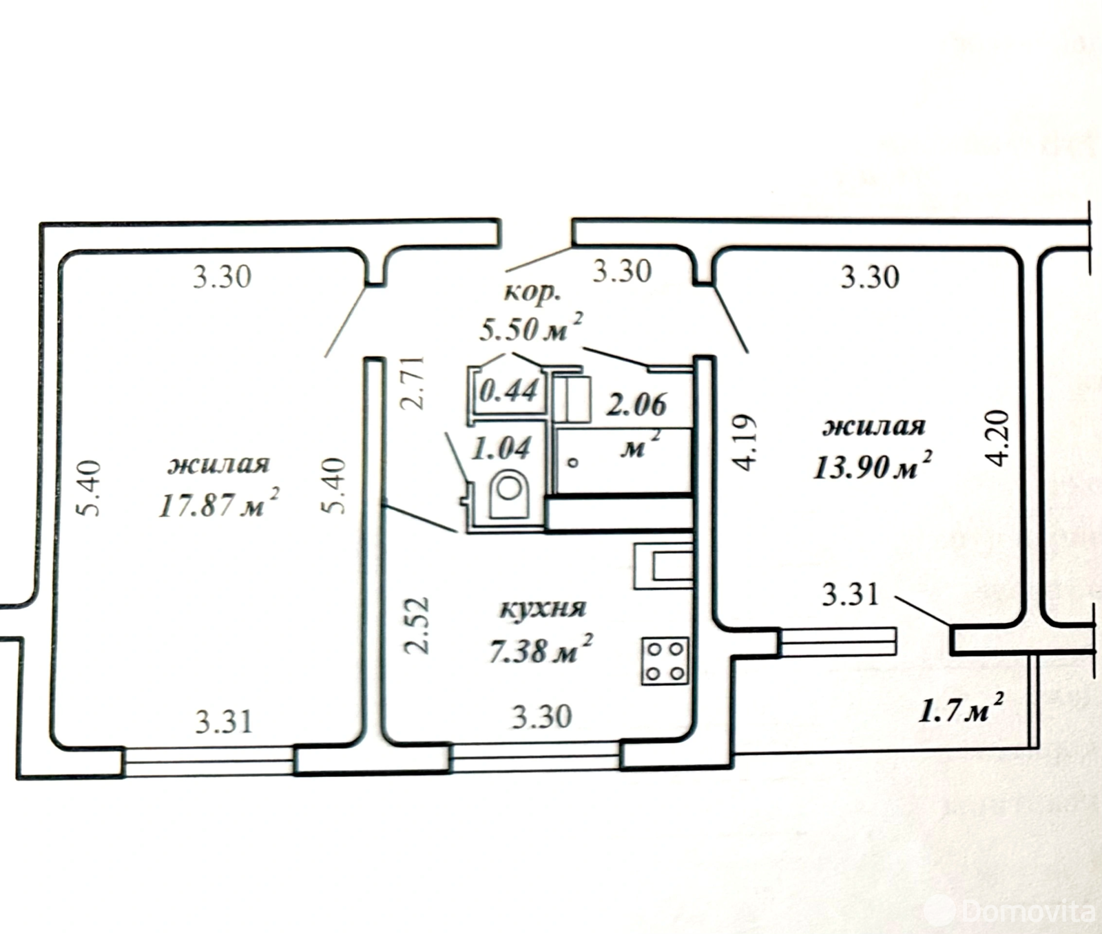 Общая площадь по СНБ 49,9 кв. м., жилая площадь 31,8 кв. м, кухня 7,4 кв. м. высота потолков 2.53 м.