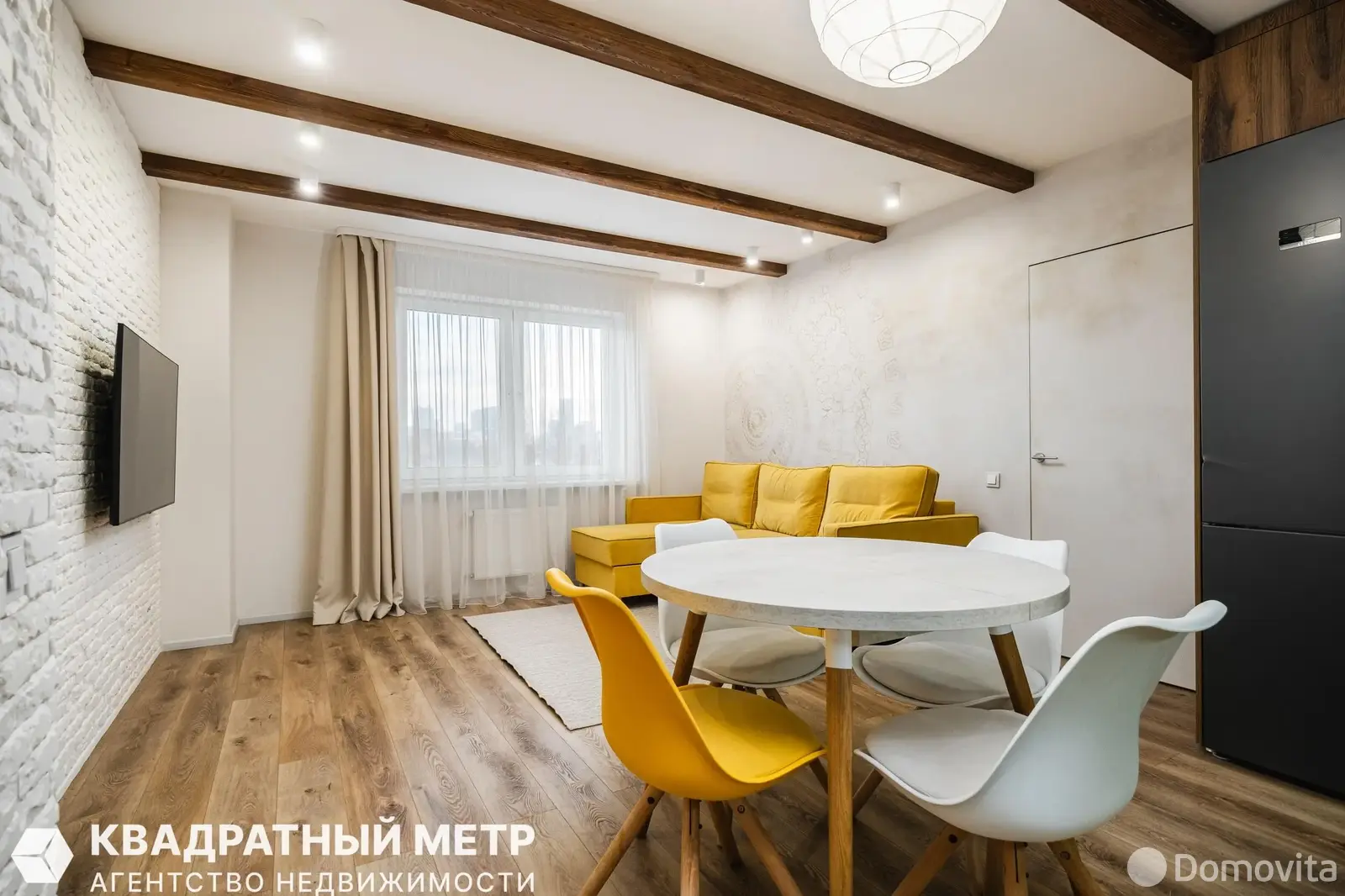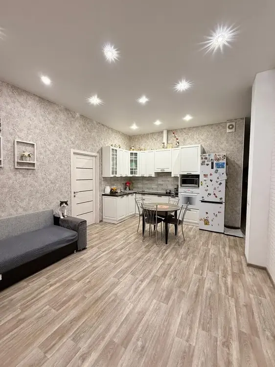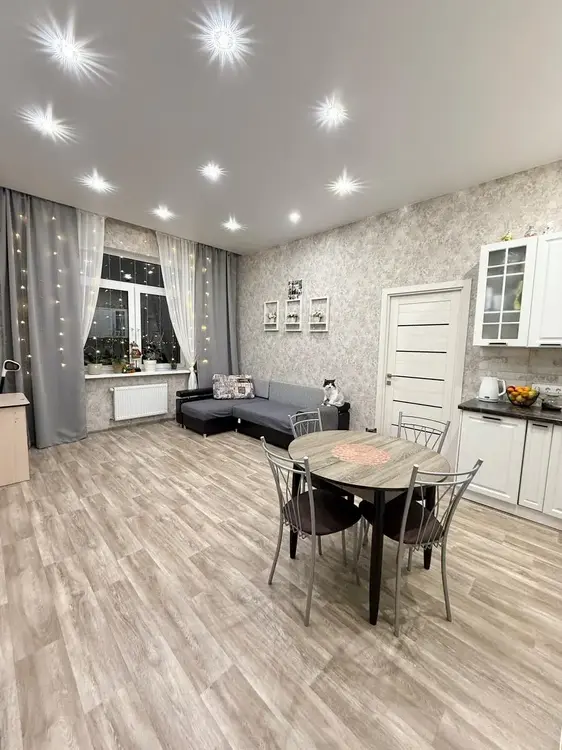 Дизайнерский ремонт с практичными материалами импортного производства, на полу-кварц винил и ламинат, на стенах декоративная штукатурка и обои, потолок — выровнен и окрашен, установлены межкомнатные двери из массива и скрытого монтажа.