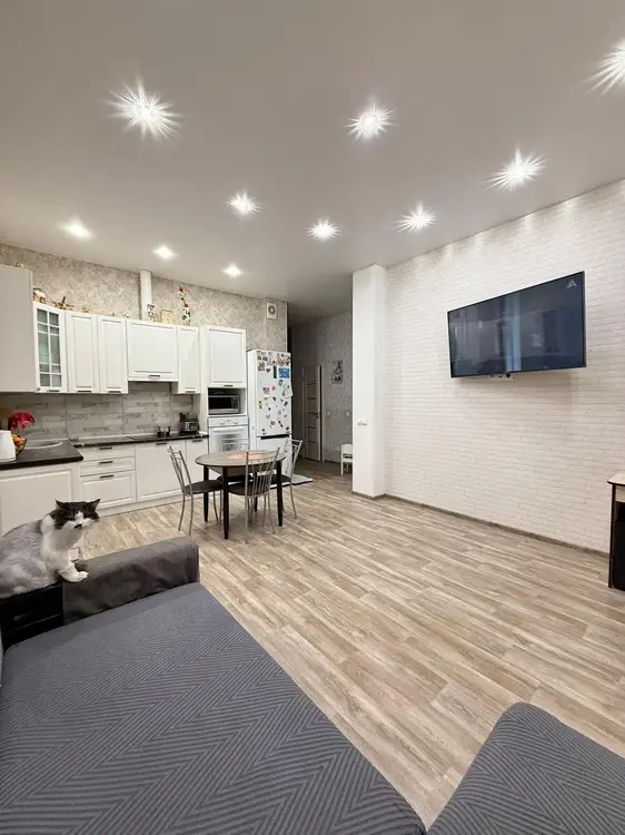 Просторная кухня с гостиной 22,4 кв.м. Вся необходимая техника. Обеденная зона. Большая ТВ-зона с уютным диваном. Все очень грамотно расположено.